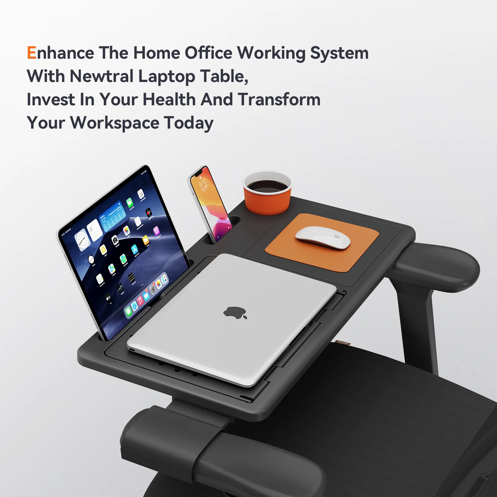 Slide, Tilt, Work: This laptop table for recliner chair fits Newtral chair armrests in seconds. Adjust height (5 levels) and angle for ergonomic screen views – whether sitting, lounging, or lying flat.